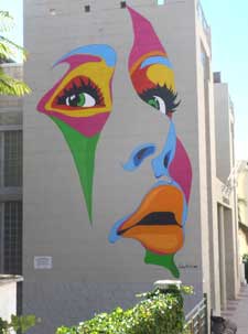 | De zijkant van het gebouw, helaas is het niet mogelijk de hele muurschildering op de foto te krijgen |